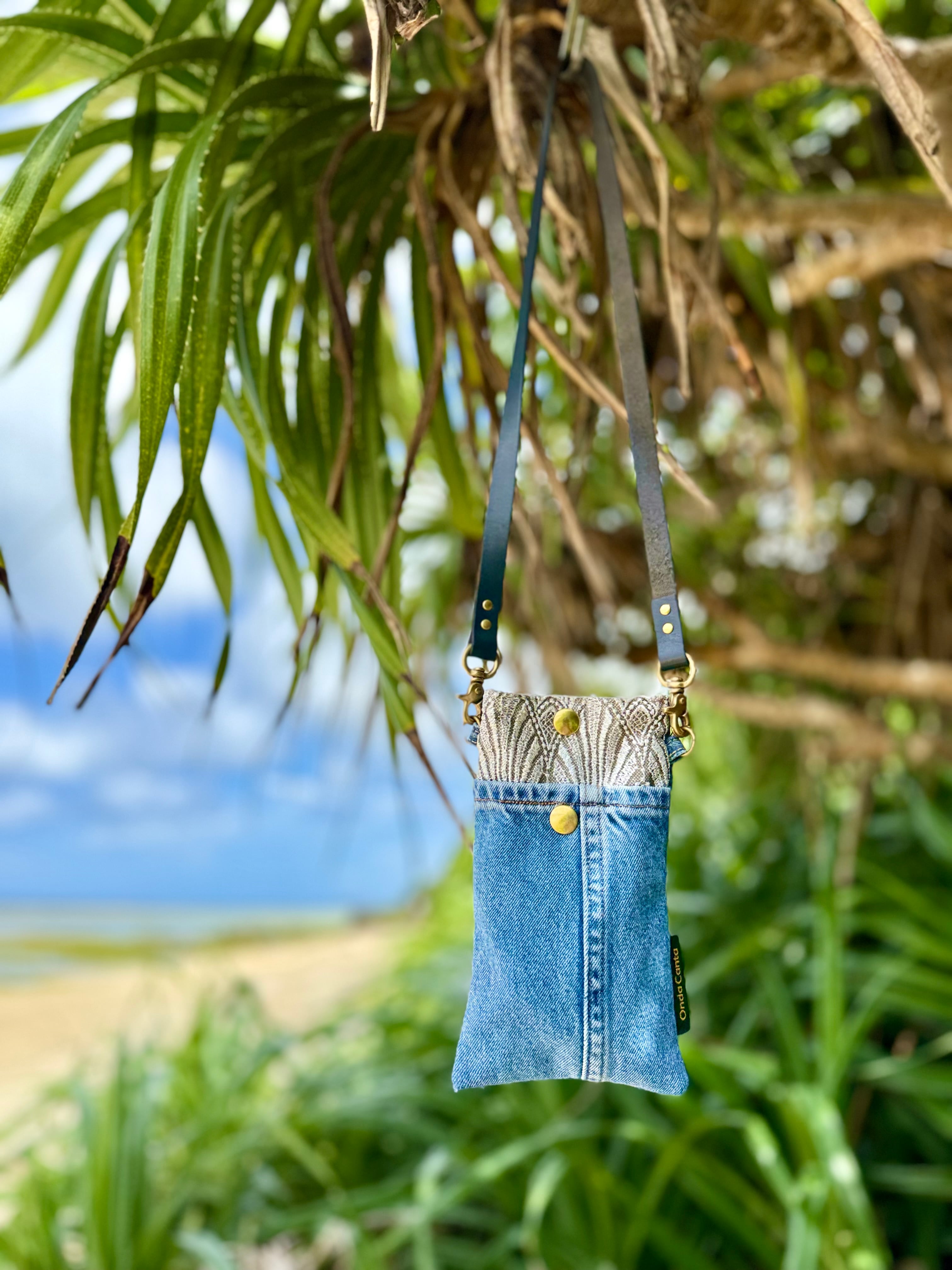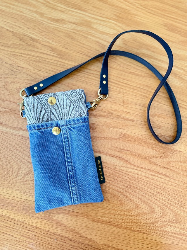 きらきらとしたヴィンテージレースをusedデニムと組み合わたスマホバッグ