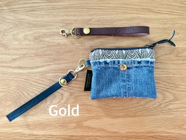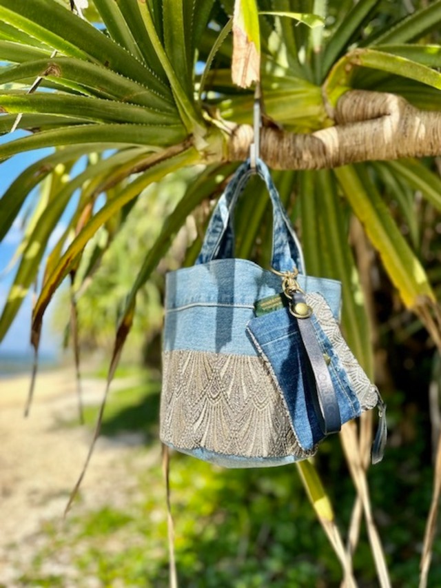 きらきらとしたヴィンテージレースをusedデニムと組み合わせ、すべて真鍮無垢の金具で作られたラグジュアリーなミニポーチ。